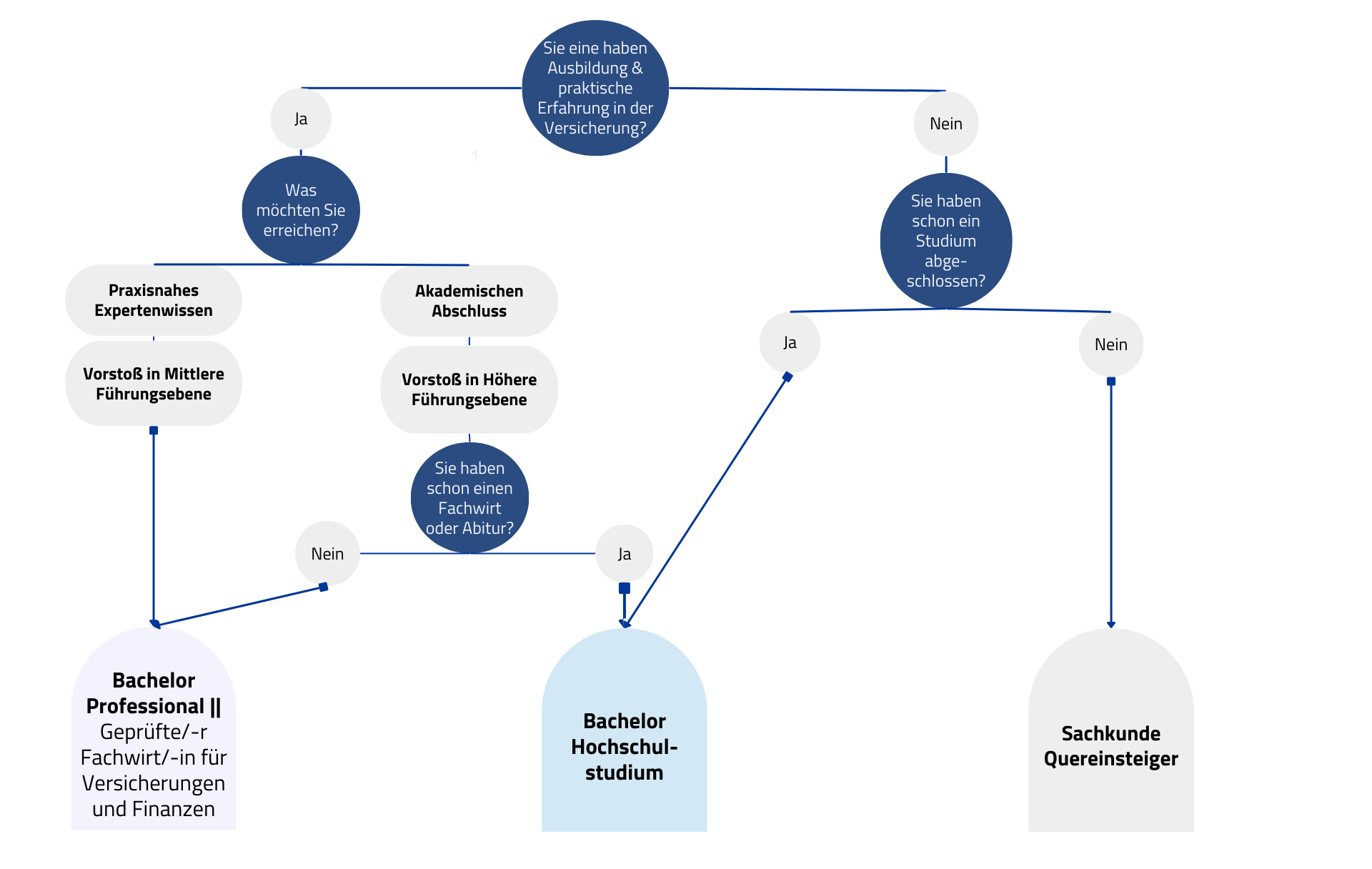 - Bachelor Professional – Eine praxisorientierte Qualifikation, verliehen durch die IHK oder Handwerkskammern, die direkt auf den Berufsalltag in der Versicherungsbranche vorbereitet. Dieser Abschluss richtet sich an Fachkräfte, die ihre berufliche Praxis vertiefen und sich gezielt auf Führungsaufgaben vorbereiten möchten.