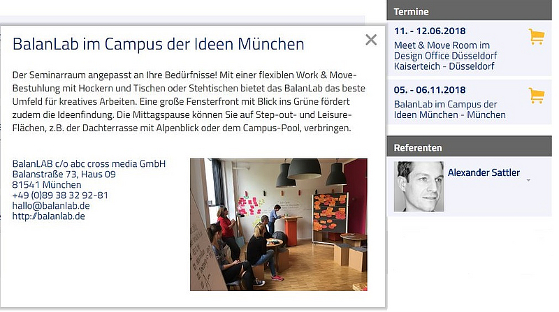 Zukünftig informieren wir Sie auf unseren Seminarseiten ausführlicher über die Veranstaltungs-Location. Klicken Sie hierfür auf den Hotelnamen am rechten Rand. In den kommenden Wochen werden Sie diese Funktion auf vielen Seminarseiten finden.
