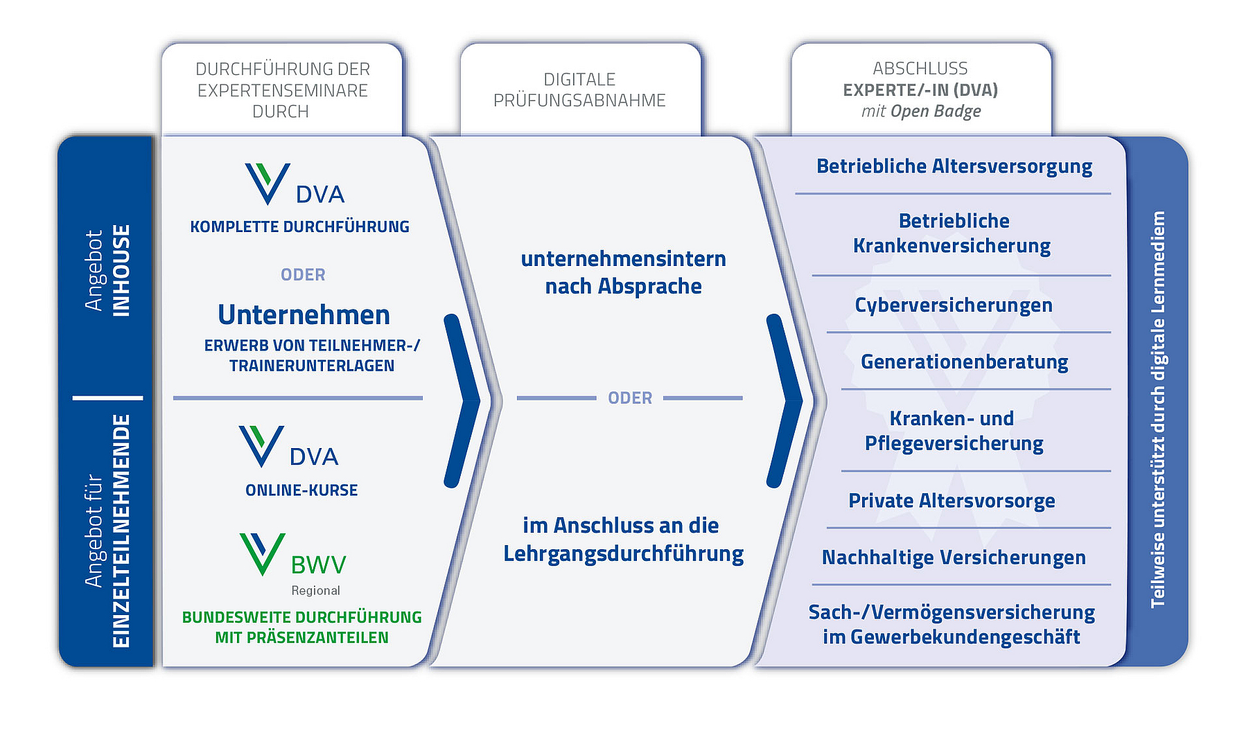 Nach erfolgreichem Abschluss Ihrer Weiterbildung erhalten Sie zusätzlich zum DVA-Zertifikat Ihr Open Badge. Mit diesem digitalen Zertifikat können Sie Ihre neu erworbenen Kenntnisse transparent digital präsentieren. Weitere Infos unter Open Badges.