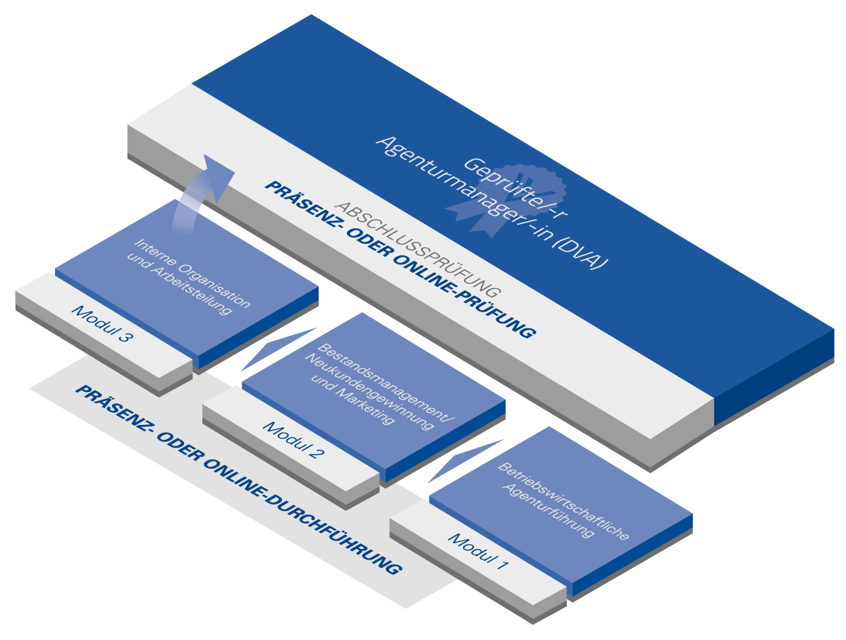 Im Qualifizierungsprogramm Geprüfte/-r Agenturmanager/-in (DVA) lernen die Teilnehmenden entscheidende Problemstellungen für die Weiterentwicklung einer Agentur kennen und diese erfolgsorientiert zu lösen. So werden wichtige Grundlagen für den Auf- und Ausbau oder für die Optimierung der Agentur gelegt.