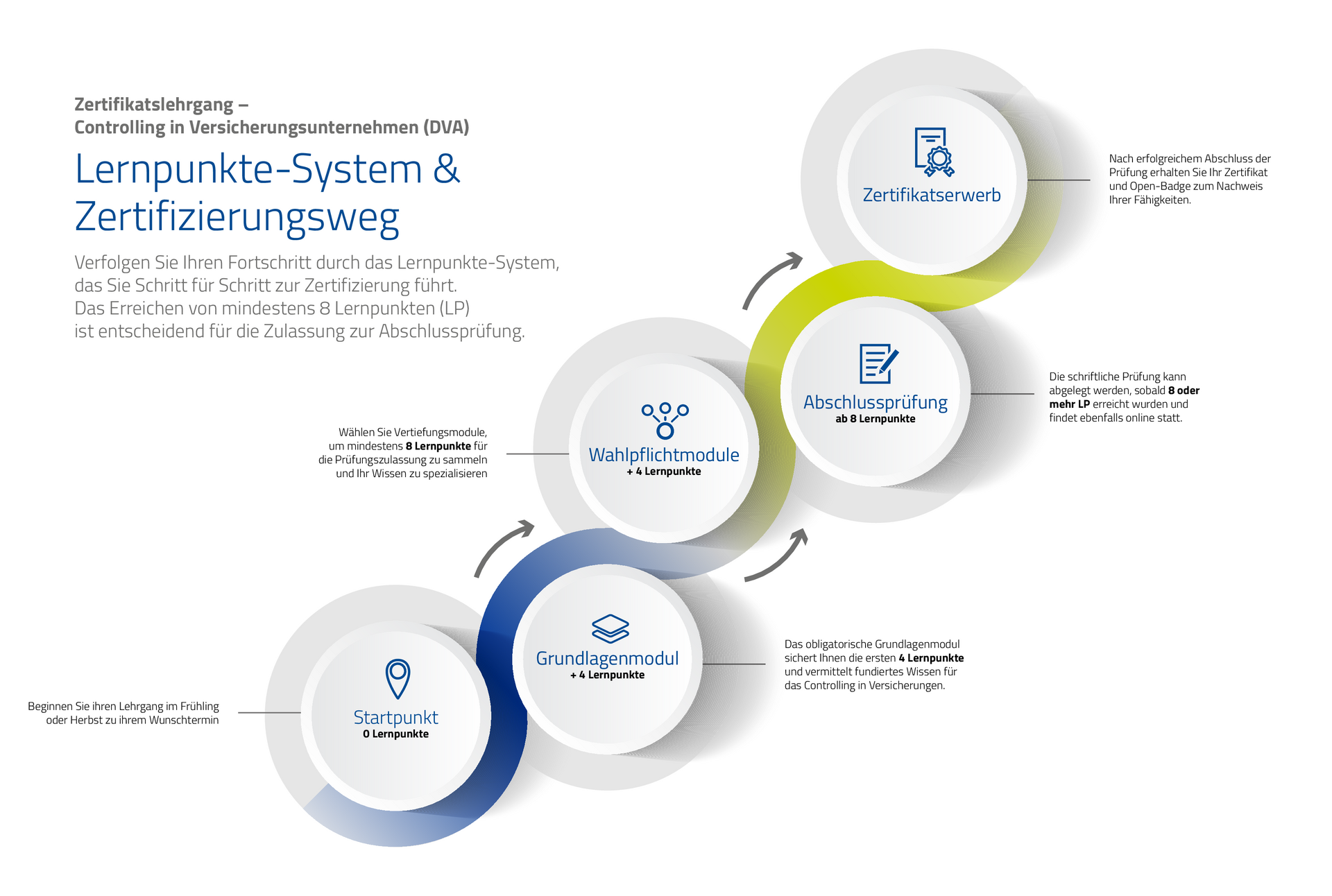 Für den anerkannten Branchenabschluss ist die Teilnahme an einem Grundlagenmodul sowie an mindestens zwei Vertiefungsmodulen erforderlich. Die Zulassung zur Prüfung erfolgt nach erreichen von mindestens 8 Lernpunkten. Anschließend legen Sie eine schriftliche Prüfung ab. Mit Bestehen erhalten Sie das Zertifikat „Geprüfte/r Controller/in in Versicherungsunternehmen (DVA)“ – der Nachweis für Ihre erfolgreiche Controller Weiterbildung.