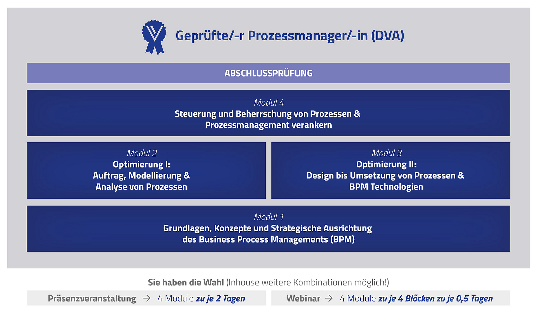 Nach Absolvierung aller vier Module wird eine schriftliche Prüfung durchgeführt. Die Abschlussprüfung findet im Anschluss an das Modul 4 statt. Nach erfolgreichem Abschluss des Lehrgangs erhalten die Teilnehmer das Zertifikat „Geprüfte/-r Prozessmanager/-in (DVA)“.