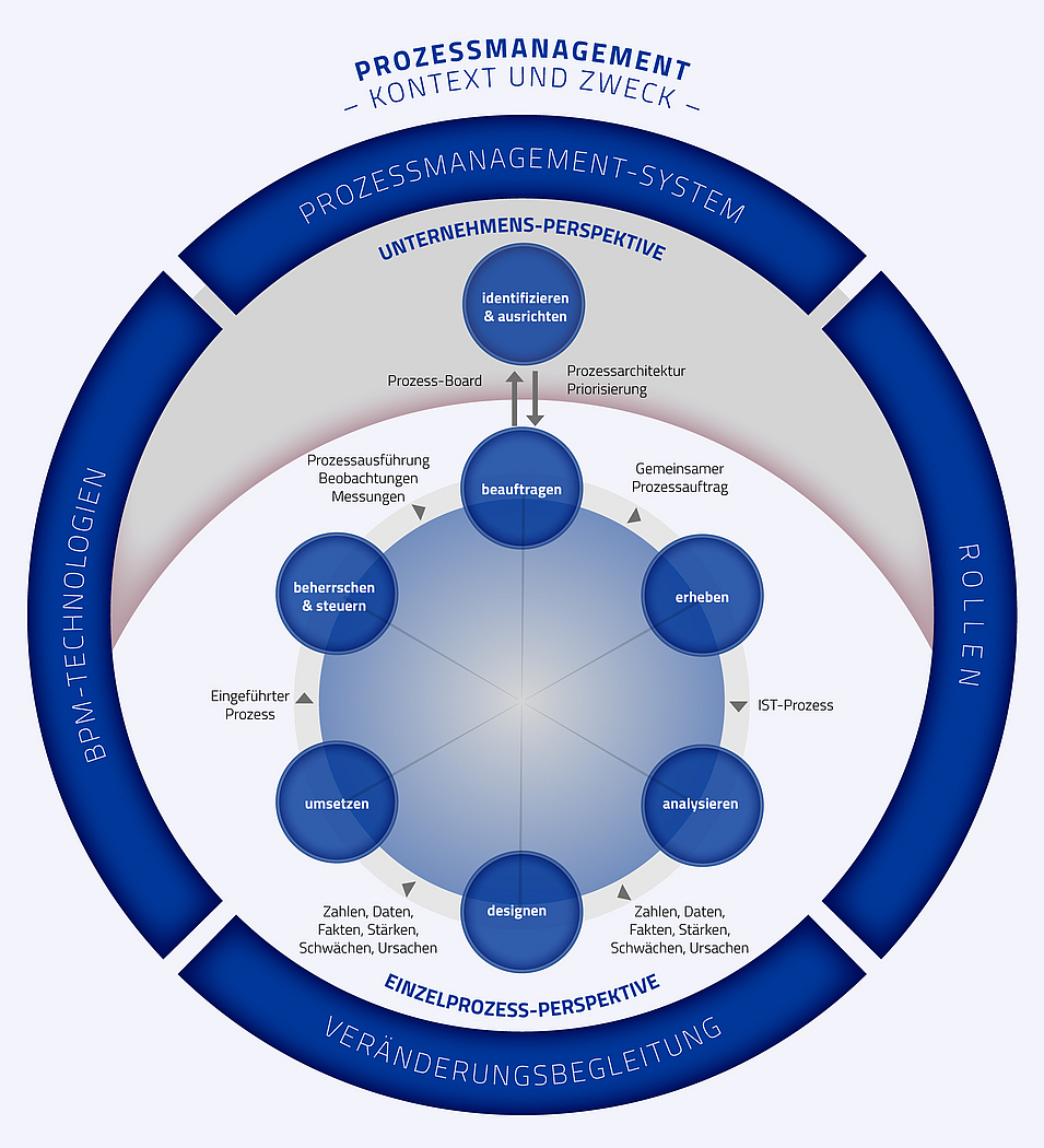 Die zentrale Fragestellung im Geschäftsprozessmanagement lautet „Wer (Akteure) macht was (Aufgaben), wann (zeitliche Abfolge), wie (Qualität), womit (Ressourcen) und zu welchem Zweck (Unternehmensziele)?“