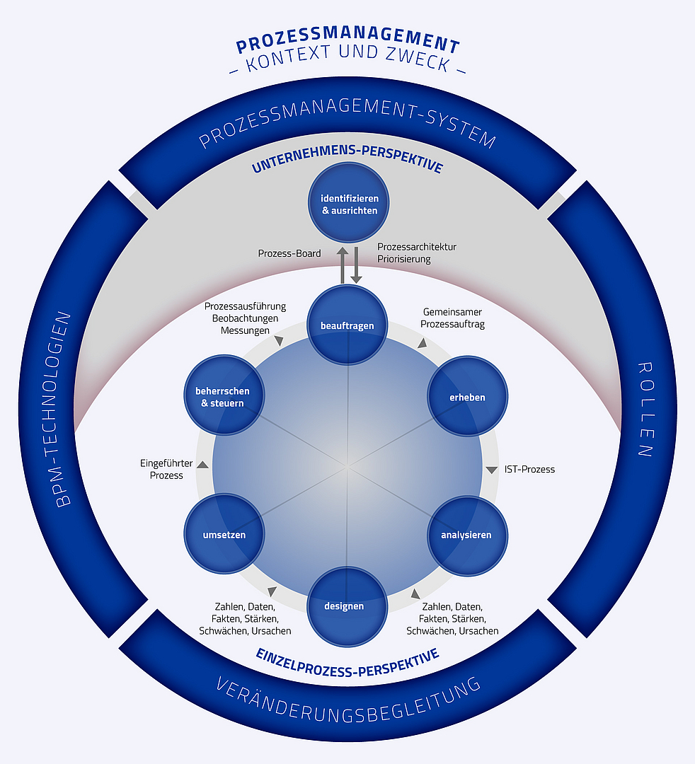 Mit den Bordmitteln für die tägliche Arbeit soll die Leistungsfähigkeit der Prozesse kontinuierlich garantiert und verbessert werden. Dazu braucht es Rollen, ein geeignetes Umfeld und ein passendes Prozessmanagement-System mit den entsprechenden Unterstützungen.