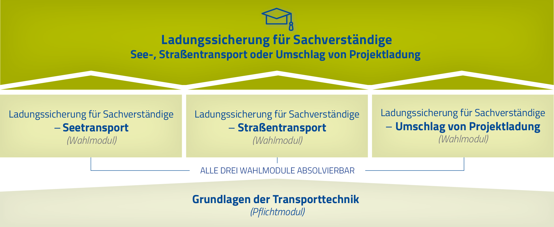 Der Lehrgang ist modular aufgebaut. Die Teilnahme am Grundlagenmodul ist verpflichtend, die anschließenden Vertiefungsmodule (See-, Straßen- oder Projektladungstransport) sind frei wählbar – je nach individuellem Bedarf.
