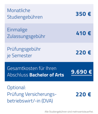 Die Studiengebühren werden monatlich fällig und belaufen sich auf 350 € monatlich. Hinzu kommen einmalig 410 € Zulassungsgebühr sowie 220 € Prüfungsgebühr pro Semester.