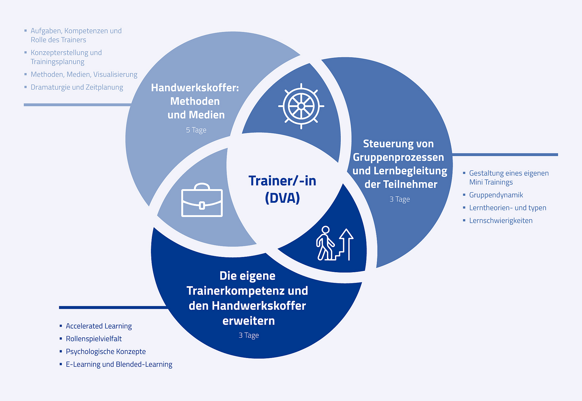 In einem kreativen Umfeld befassen sich die Teilnehmenden mit den elementaren Grundlagen erfolgreicher Trainingsgestaltung und üben unterschiedliche Techniken zur Initiierung zielgerichteter Lernprozesse für verschiedene Zielgruppen ein. Im Rahmen ihrer Ausbildung erarbeiten sich die Teilnehmenden Schritt für Schritt ihren persönlichen „Handwerkskoffer“ und bestücken diesen mit „Werkzeugen“. Durch konstruktives und intensives Kollegen- und Trainerfeedback werden die eigenen Fähigkeiten erweitert und professionalisiert.